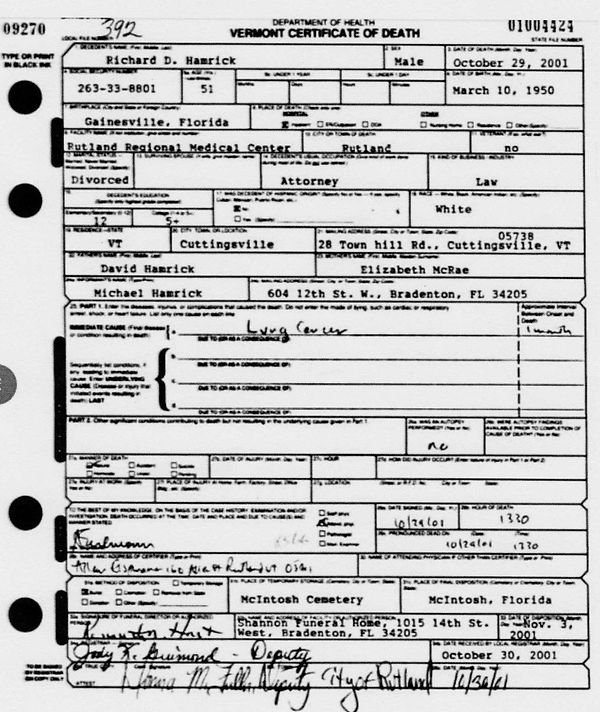 Richard D. Hamrick, 51, Rutland, Vt., and formerly of Bradenton, died Oct. 29, 2001.