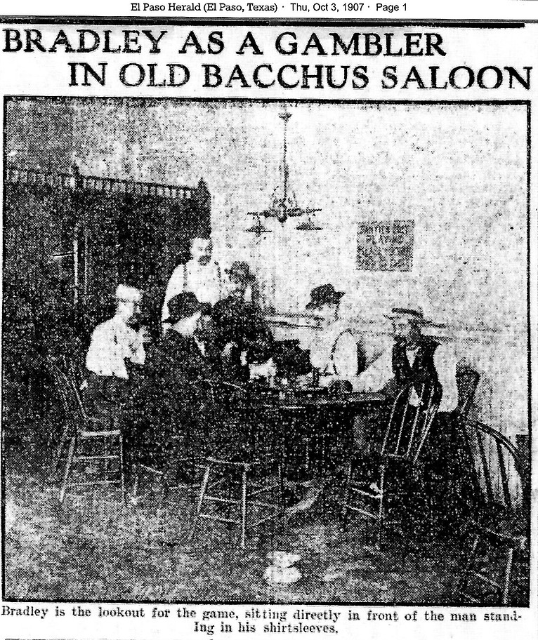 "He had become a square gambler and the house of which he was manager for McLein was lucky, winning a lot of money. John Bradley left El Paso for good about 1889, having accumulated a good start from the profits of the McLein house in the Center Block.