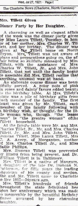 Carrie McRae, the infant daughter of Mr. and Mrs. C. W. Tillett, died Christmas morning at their home on North Tryon street, and the funeral services were conducted yesterday morning at 10:30 be Rev. Dr. Bays, assisted by Rev. Dr. Preston. A large number of friends gathered to express by their presence their sympathy for the bereaved parents. the services were sweet and simple, and about an hour after there was a new little mound in Elmwood.