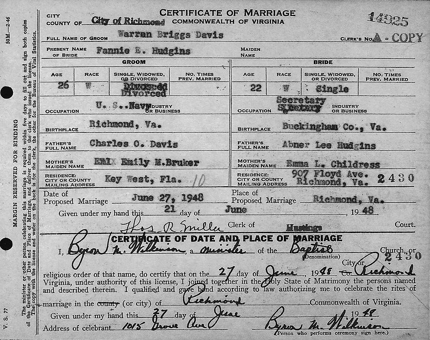 DAVIS, Fannie Hudgins, age 87, of Richmond, went to be with the Lord on July 2, 2013. She was preceded in death by her husband, Warren B. Davis.